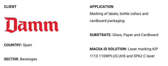 Our advanced marking methods allow perfect integration into our customer production or packaging lines. Savings in time and costs, improved productivity, better efficiency, increased reliability and greater technological capacity are just some of the competitive advantages that are obtained as a result of this integration that Macsa id can offer leading brands, such as Damm.